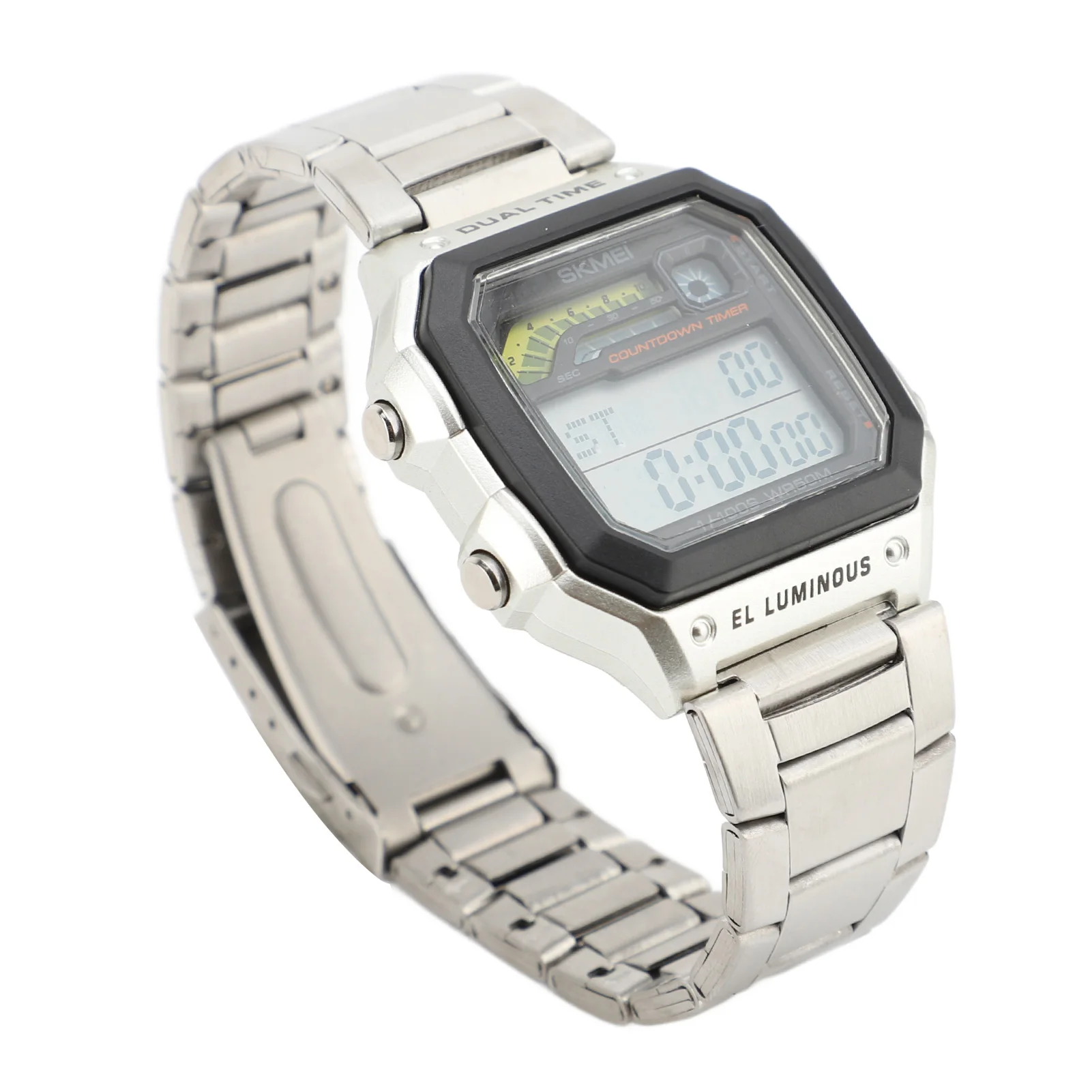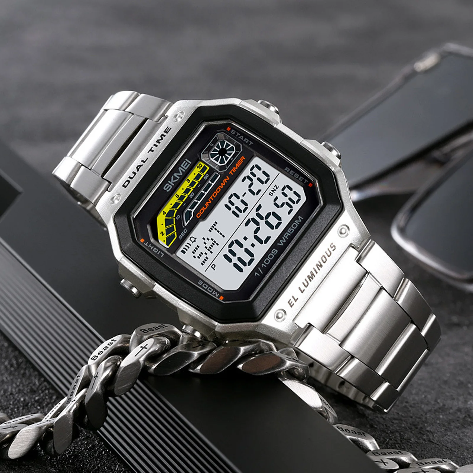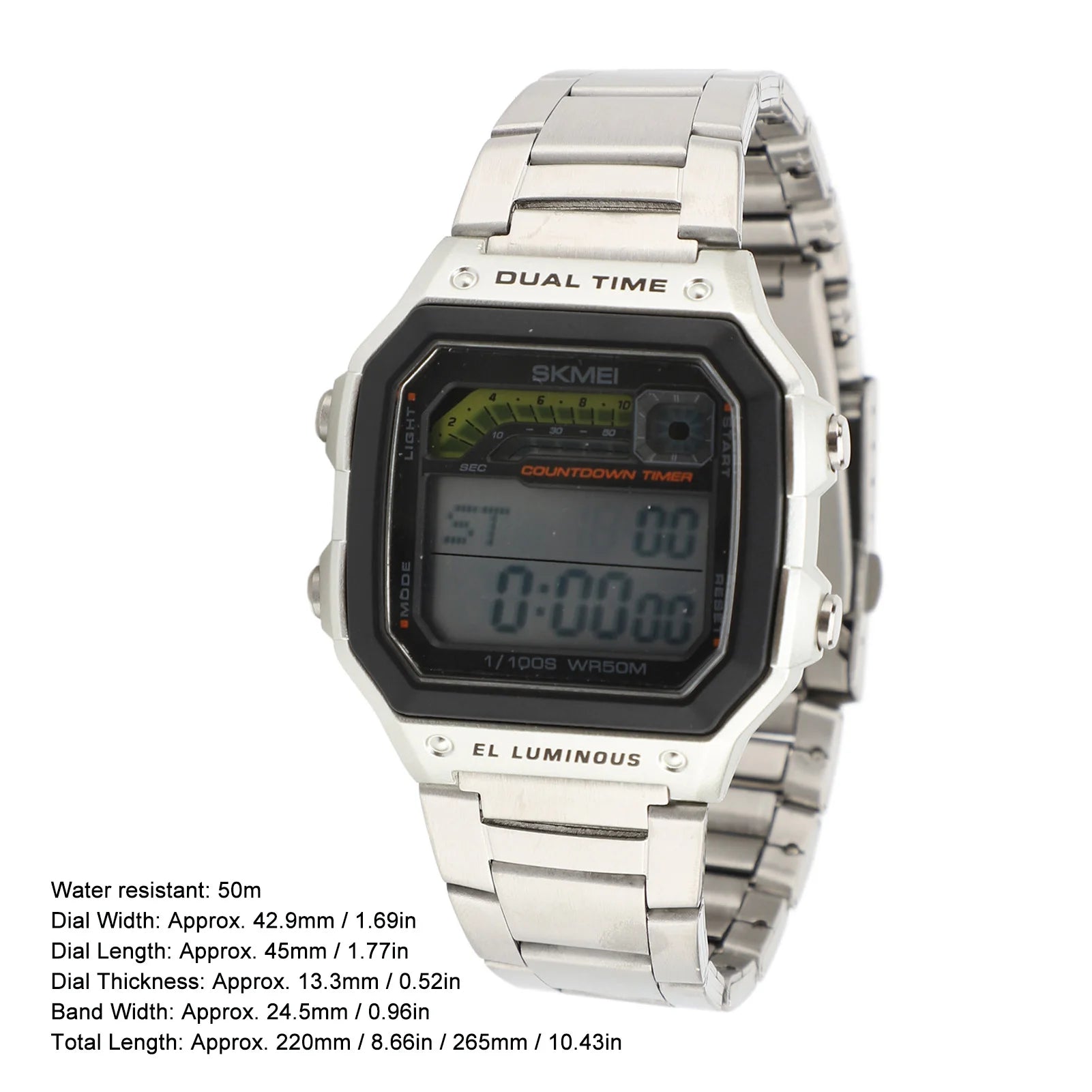 1. 50 Meter Water Resistance: This outdoor sports electronic watch is water resistant up to 50 meters. However, this does not mean it can be submerged in water 50 meters deep; rather, it can withstand 5 atmospheres. This standard is based on laboratory testing conditions where the temperature is maintained between 20‑25 degrees Celsius, with both the watch and water in a static state.2. Cool Student Watch: Featuring a metal strap, this watch beautifully showcases your personality and energy, making it the great way to elevate your street style. Ideal for expressing your vitality and youth, it is great for students who enjoy digital dual time watches.