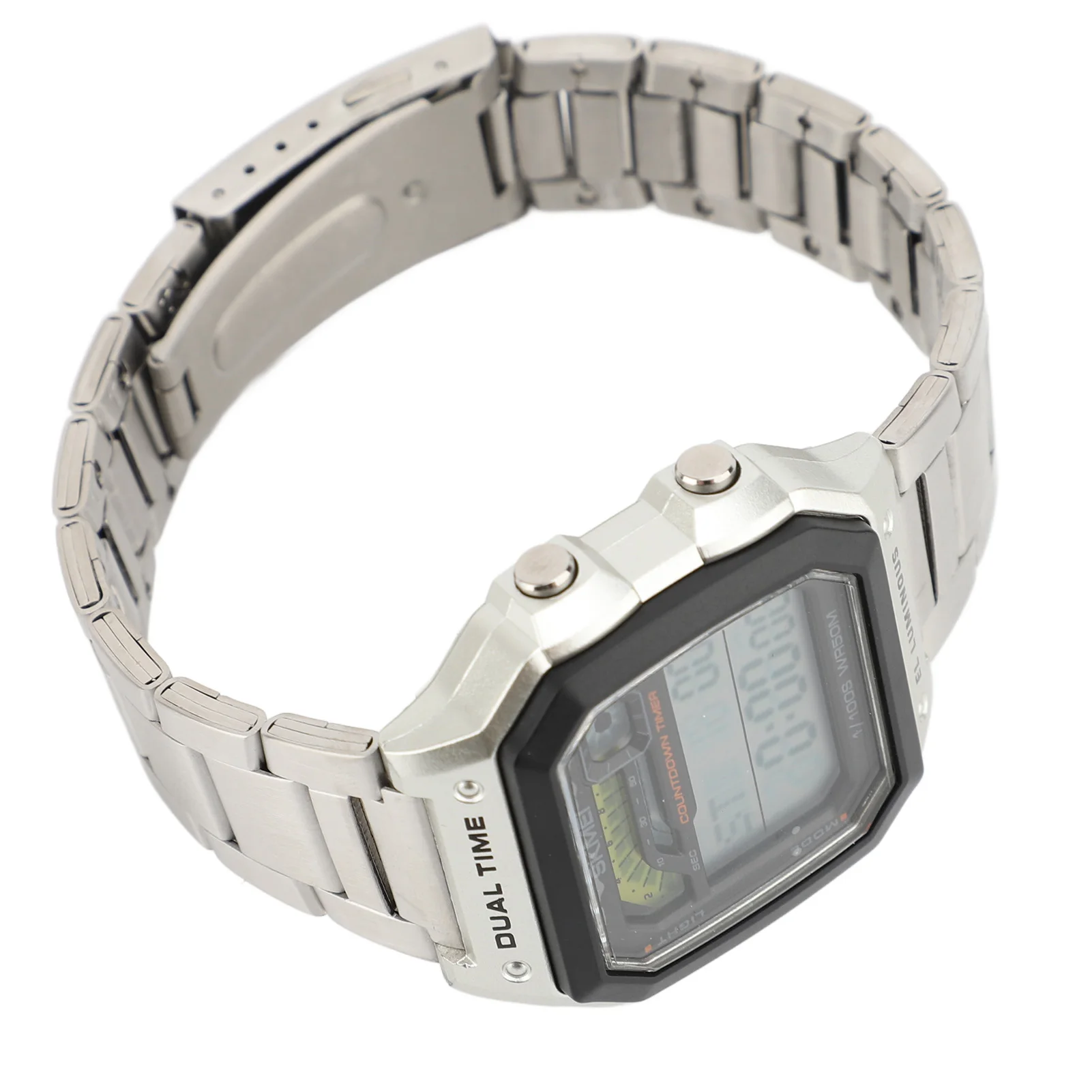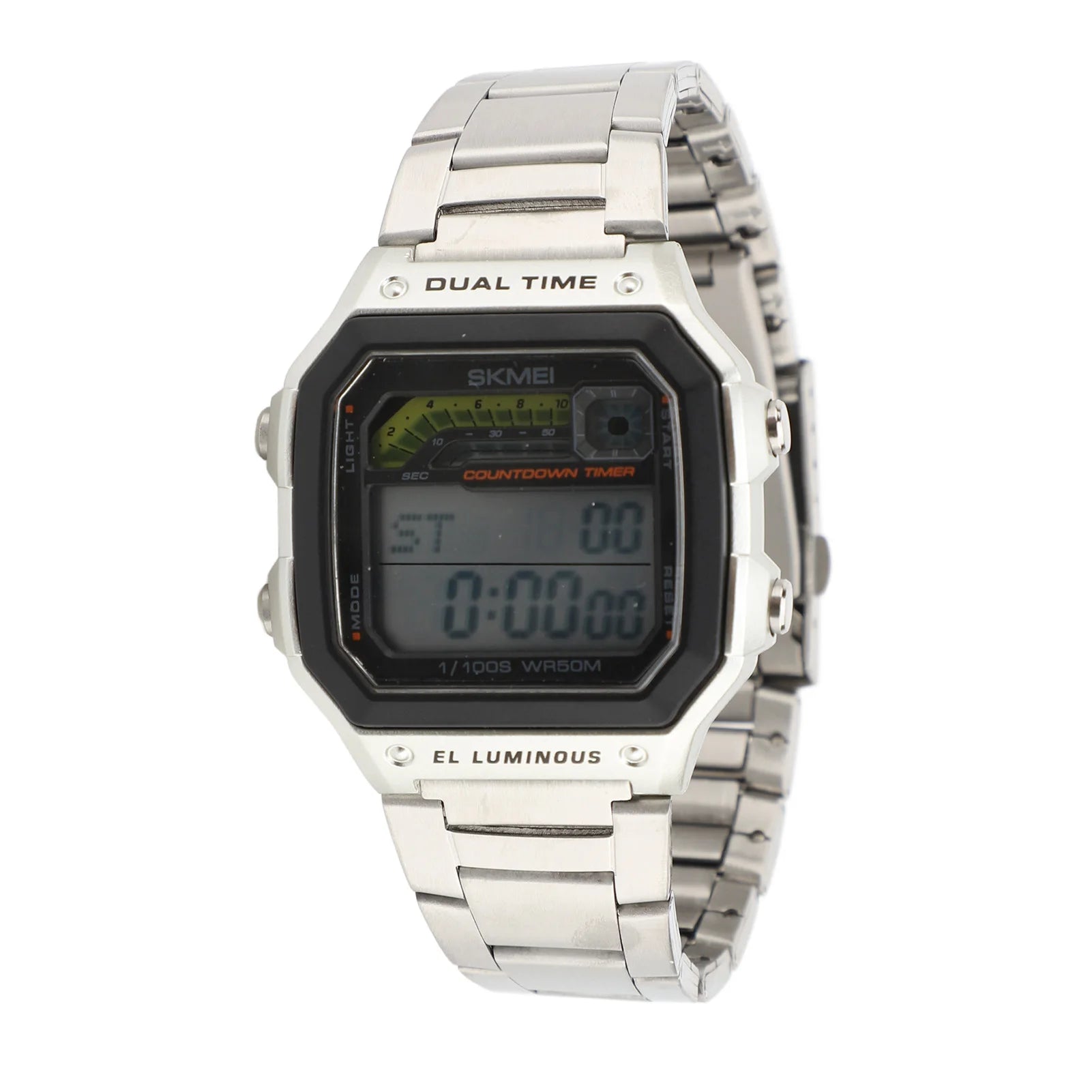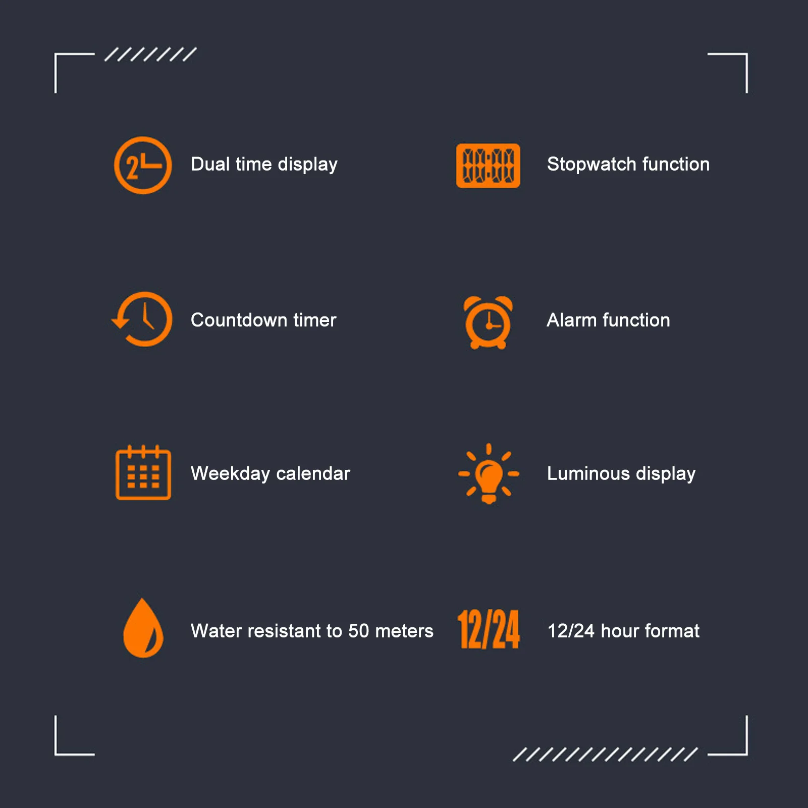 1. 50 Meter Water Resistance: This outdoor sports electronic watch is water resistant up to 50 meters. However, this does not mean it can be submerged in water 50 meters deep; rather, it can withstand 5 atmospheres. This standard is based on laboratory testing conditions where the temperature is maintained between 20‑25 degrees Celsius, with both the watch and water in a static state.2. Cool Student Watch: Featuring a metal strap, this watch beautifully showcases your personality and energy, making it the great way to elevate your street style. Ideal for expressing your vitality and youth, it is great for students who enjoy digital dual time watches.