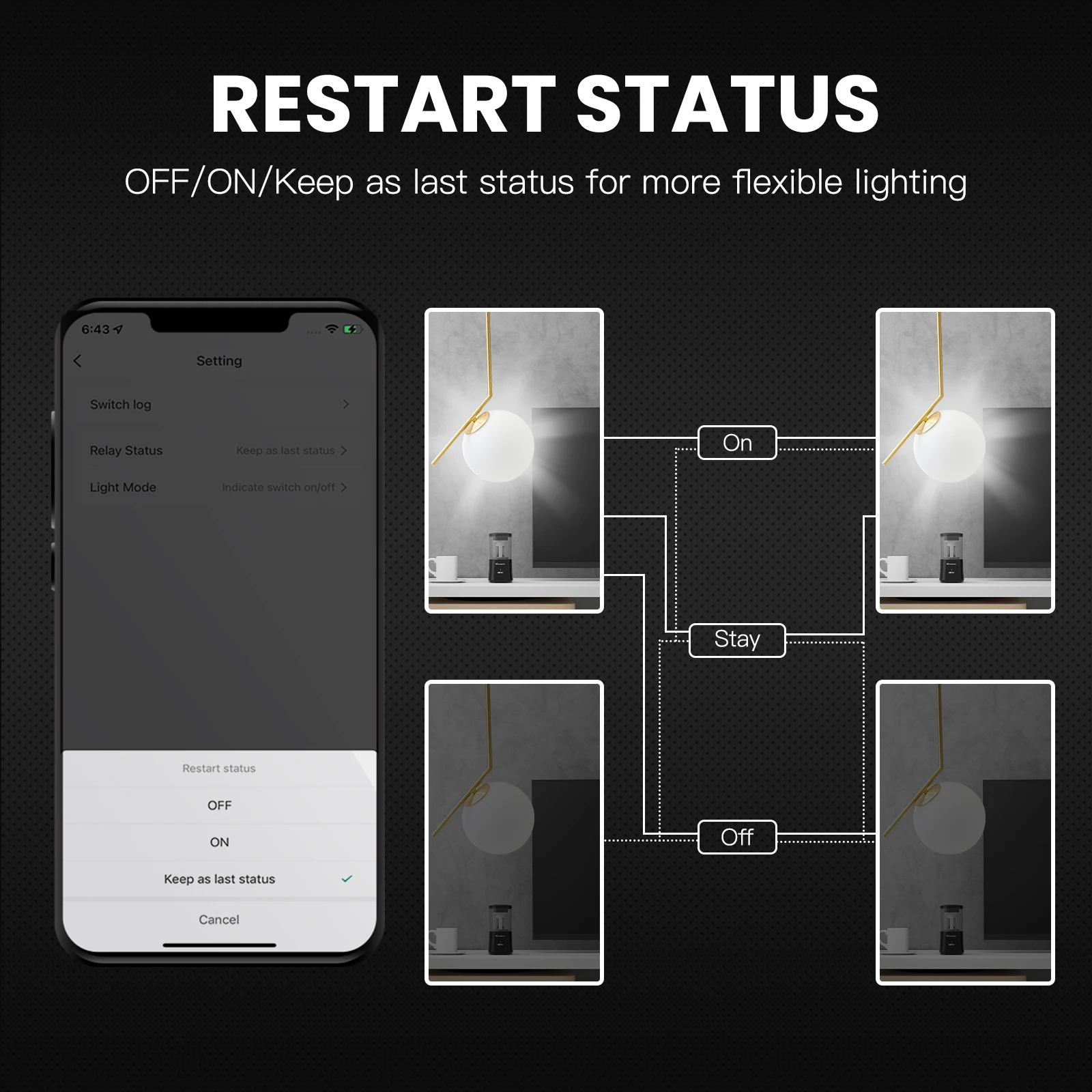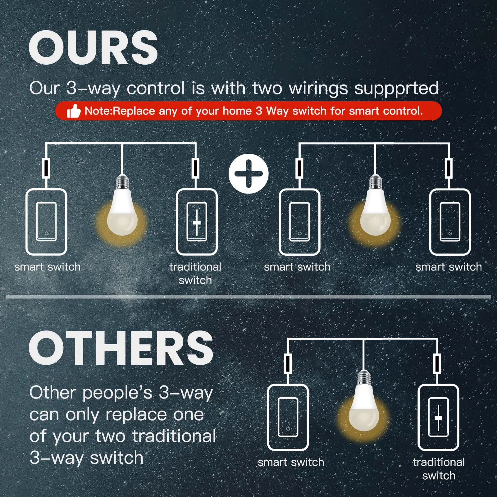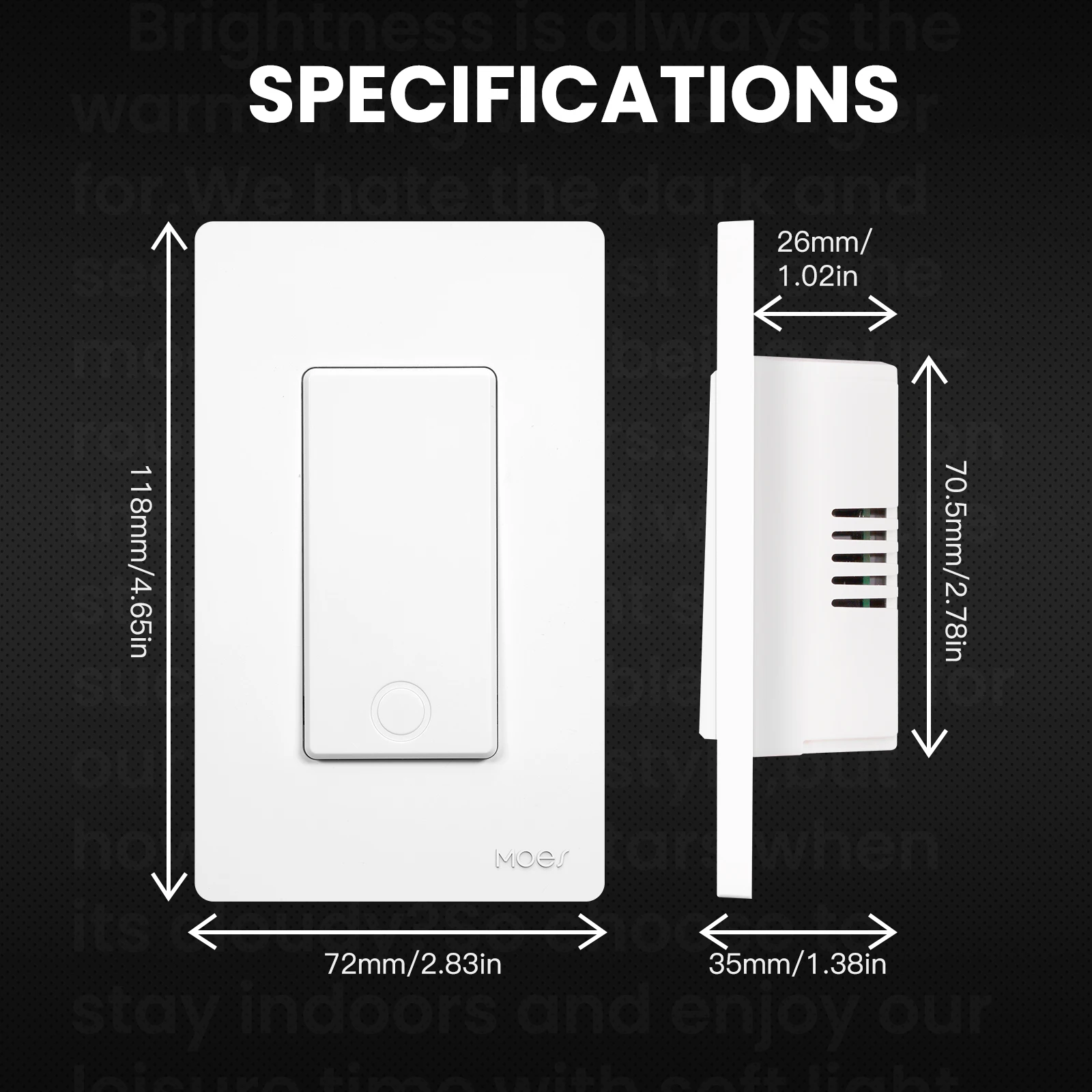 Compatible with MOES/Tuya Smart APP enables it to control via smart phones for smart lighting,wireless remote control when you are not at home,and even add different kinds of schedule for flexible timer control;Voice assistants are available for simple voice control;Multi-control associate is updated for controlling one light with another 3 Way concept.